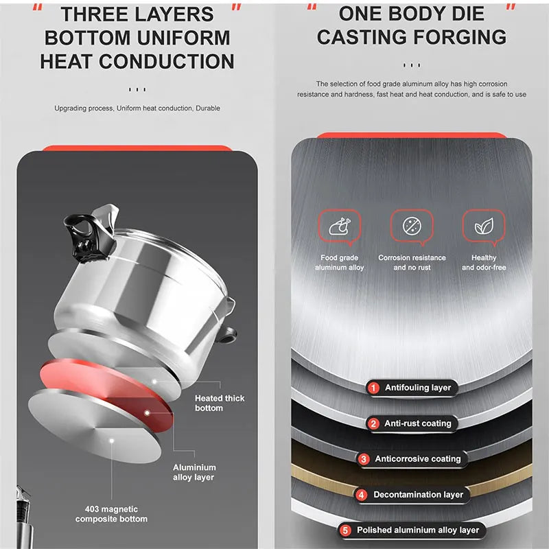 Panela de pressão de alumínio 3L/5L/7L com válvula de segurança, ideal para cozinhas a gás. À prova de explosão.