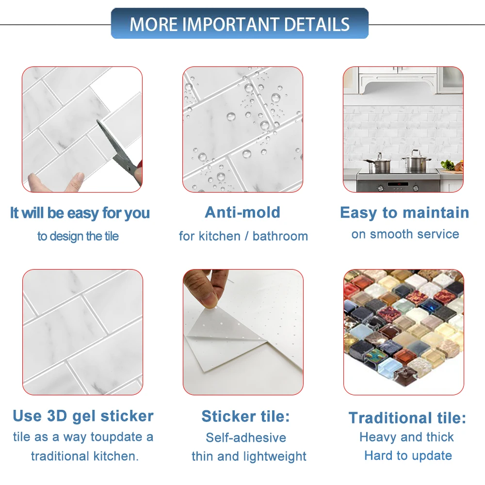 Os azulejos autoadesivos podem ser aplicados em todas as superfícies lisas, limpas e secas, como paredes de gesso pintadas ou até mesmo sobre azulejos cerâmicos. Basta remover a película protetora e colar, é muito fácil de instalar. Tudo o que você precisa é de uma régua, um lápis, um pano e uma tesoura. Este projeto economizará muito tempo e dinheiro em comparação com a instalação de azulejos tradicionais. E não precisa se preocupar se o azulejo não se encaixará no tamanho da sua parede, pois é fácil de cortar.